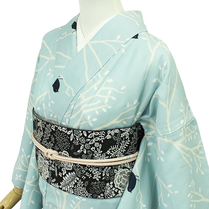 単衣小紋 洗える着物 自然 水色 小鳥柄 ナチュラル かわいい きもの 9月 6月 裏地なし 着物